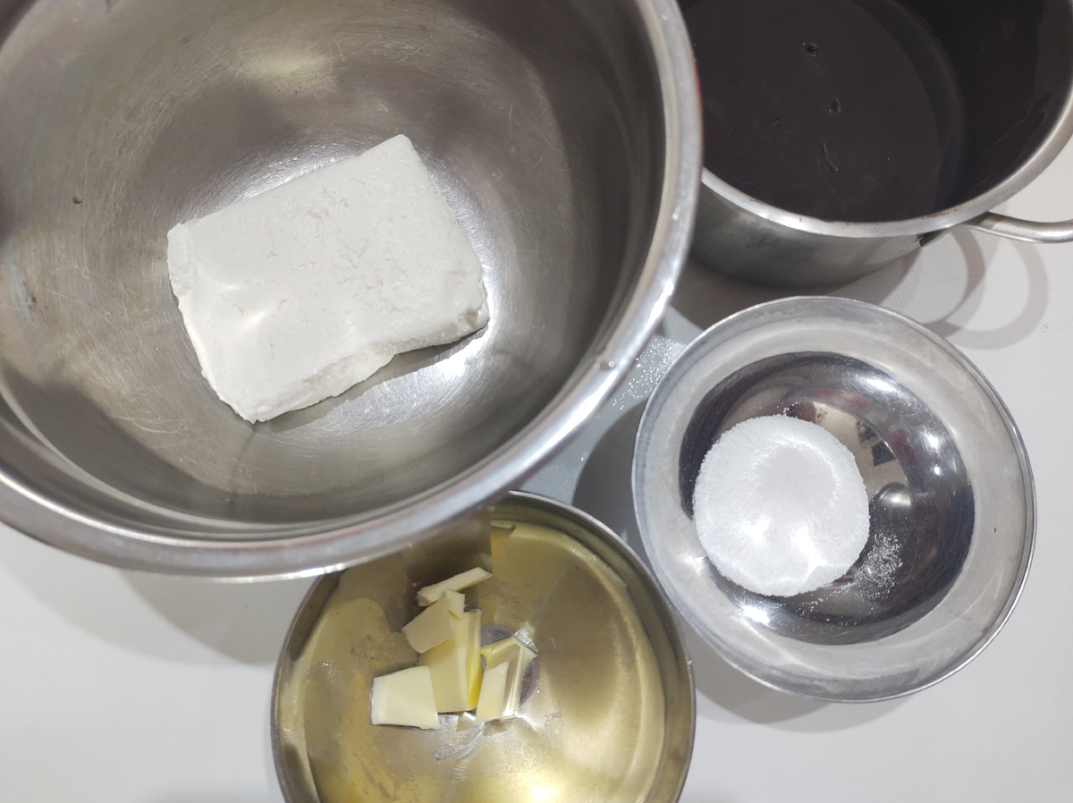 Приготовление этого десерта не займет много времени, а процесс довольно простой. Первым делом следует объединить творог, размягченное сливочное масло и сахарную пудру. Смешивание с помощью блендера поможет добиться однородной консистенции — никаких крупинок творога не должно остаться.