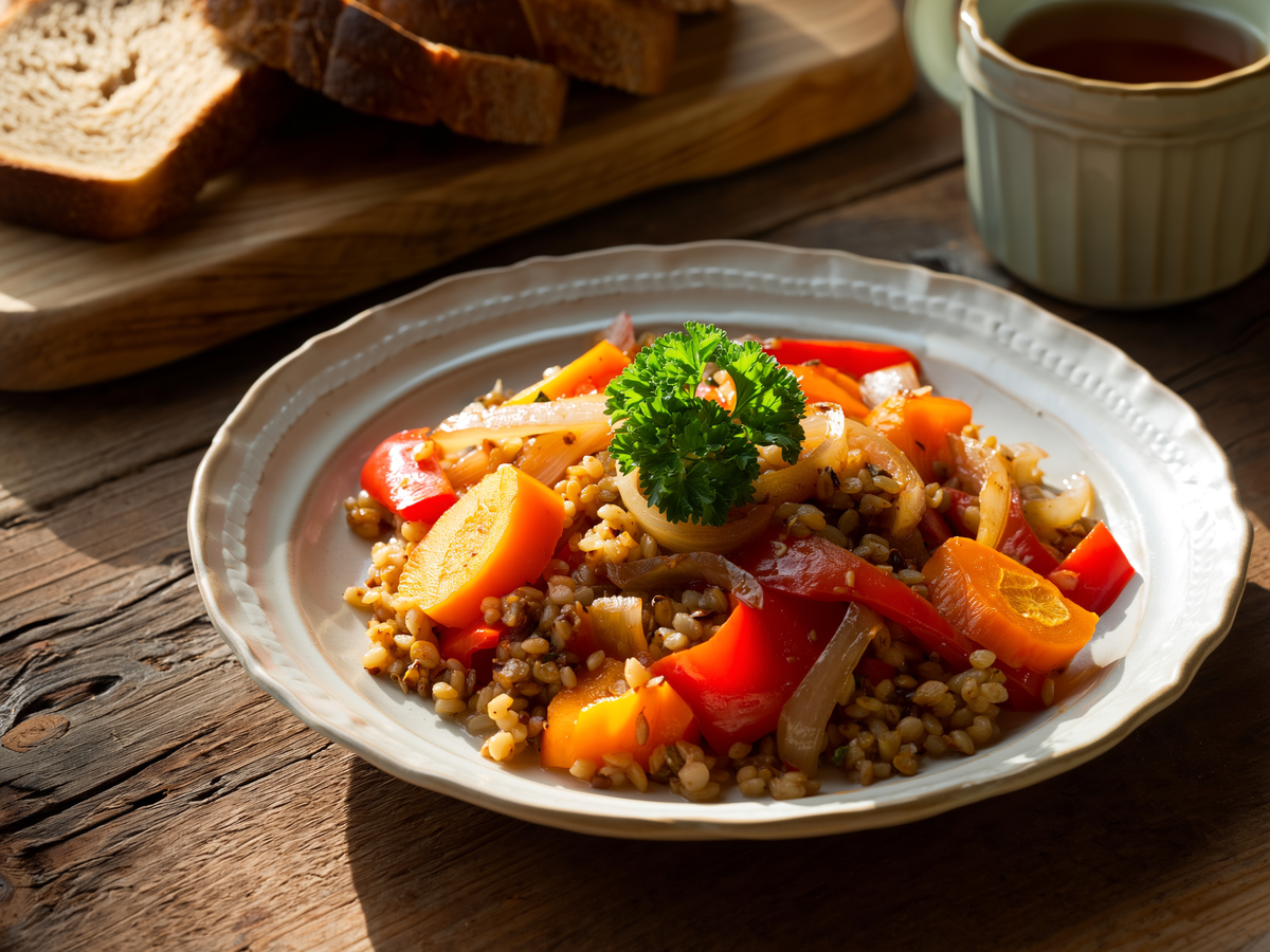 Гречка с овощами в деревенском стиле – это не только просто, но и невероятно сытно. Забыть о скучных гарнирах можно с этим блюдом, которое вызывает теплые воспоминания о детстве и бабушкиных кулинарных шедеврах. Ароматная, рассыпчатая крупа, вместе с мягкими овощами и чесноком, сделает любое блюдо по-настоящему вкусным. Готовится все в одной сковороде, а значит, не потребуется много времени и усилий — идеальный выбор как для обеда, так и для ужина. Даже без мяса это сочетание будет настоящим кулинарным хитом!