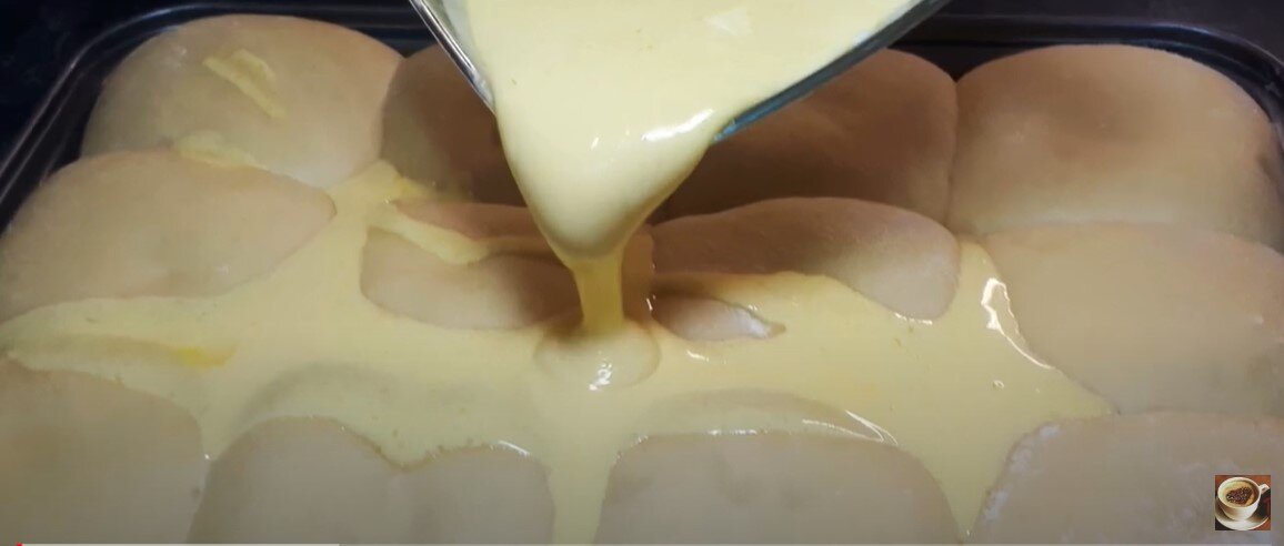 После того как тесто подойдет, его нужно разделить на 12 равных частей, каждую раскатать в круглую лепешку и поместить начинку в центр. Завернуть края, чтобы получилась булочка, и выложить все 12 заготовок в прямоугольную кондитерскую форму размером 20х30 см. Далее дайте булочкам немного подняться, а затем полейте их приготовленной заливкой.