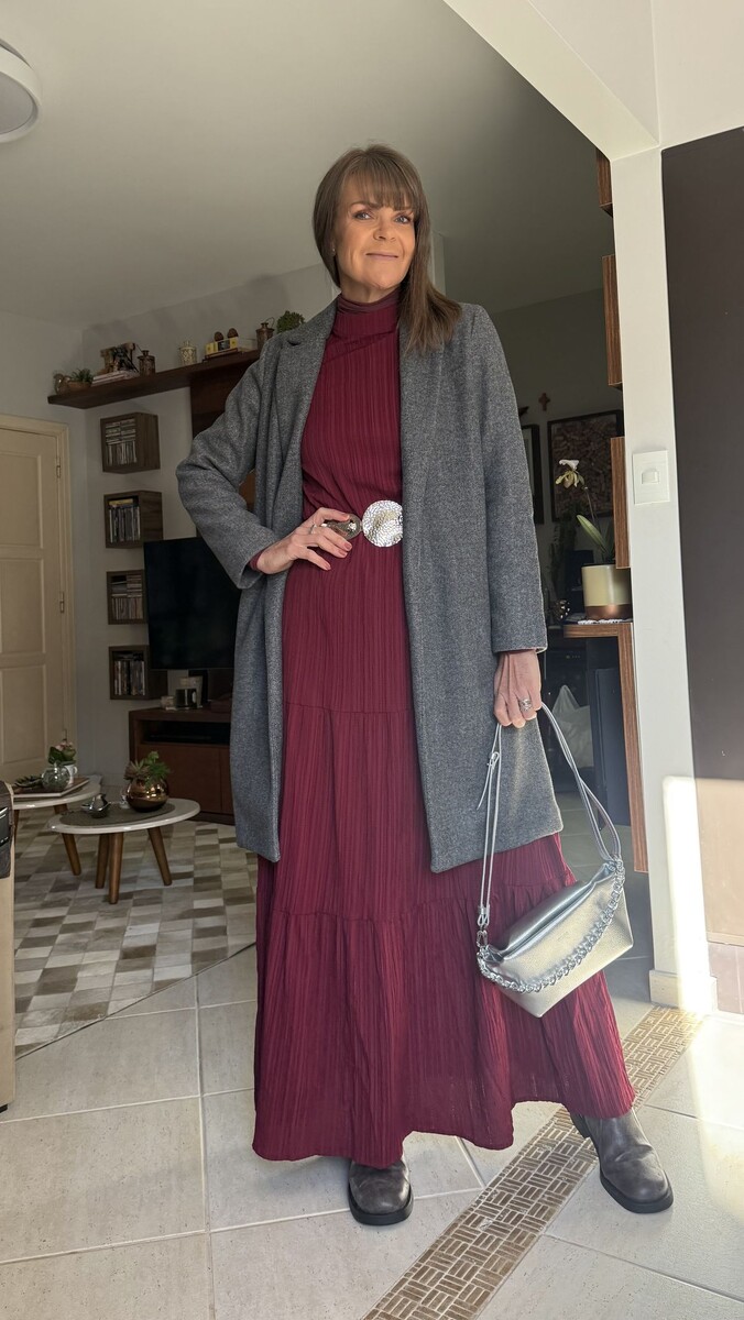 - Элегантное бордовое платье в пол с плиссировкой станет отличным выбором для любого случая. Дополните его поясом с металлическими элементами и серым пальто средней длины для завершенного образа.