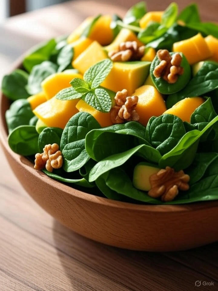 Манго содержит множество витаминов, таких как A и C, которые помогают поддерживать иммунитет и ухаживают за кожей. Соединение манго с такими компонентами, как шпинат и авокадо, создаёт гармония питательных веществ — железа и полезных жиров. Грецкие орехи не только добавляют текстуру, но и насыщают блюдо белком и энергией. Таким образом, салат становится не просто вкусным, но и сбалансированным угощением, подходящим как для обеда, так и для лёгкого ужина.