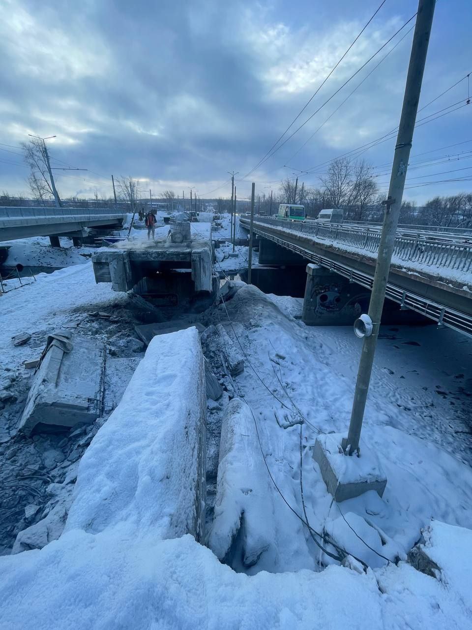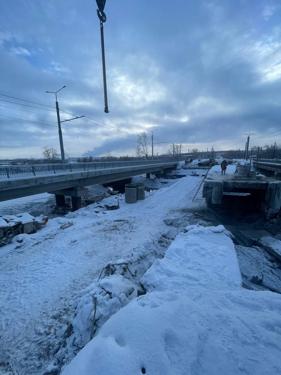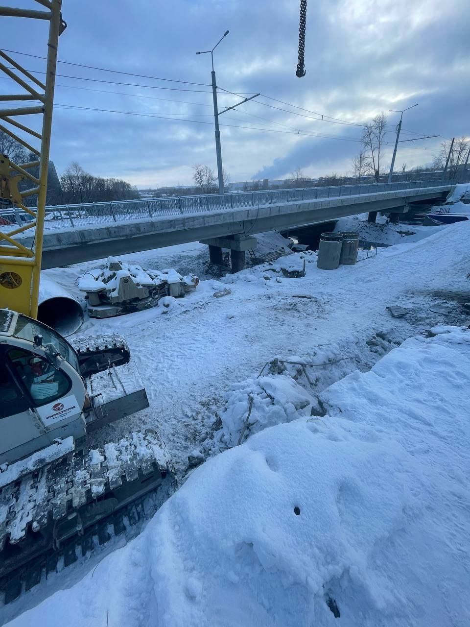 Строительство моста на Черкасской продолжается. Оно стартовало весной 2025 и не прекращается даже зимой.