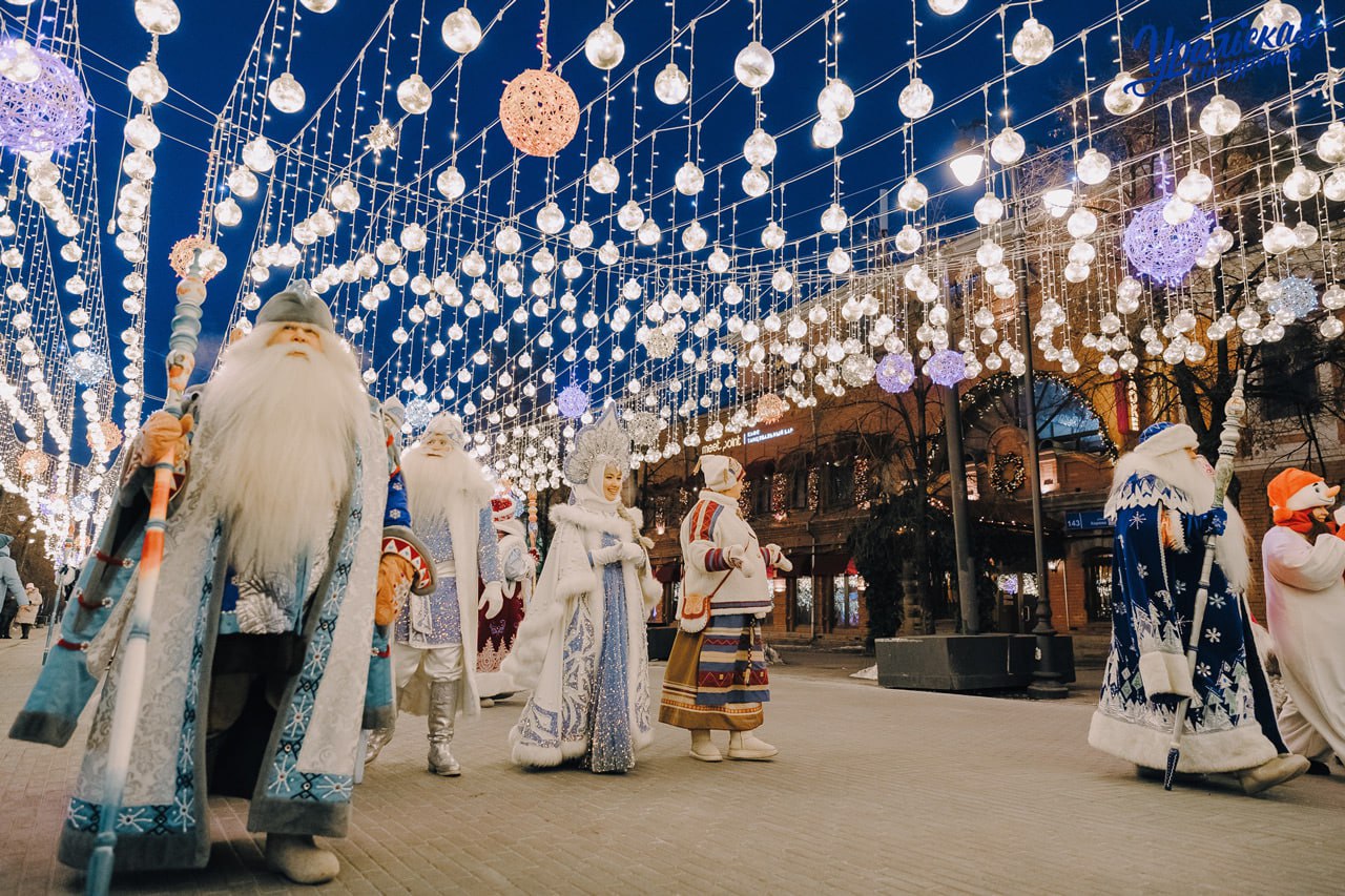 В Челябинск приедут Деды Морозы из Архангельской области и Дагестана, Урал Мороз и его внучка Капель из Свердловской области, Буран Бай и Кархылу из Башкирии, Снегурочка Огневушка из Златоуста, Дед Мороз Морозко из Магнитогорска. Уральскую Снегурочку поздравит и Качар Мороз из Казахстана.