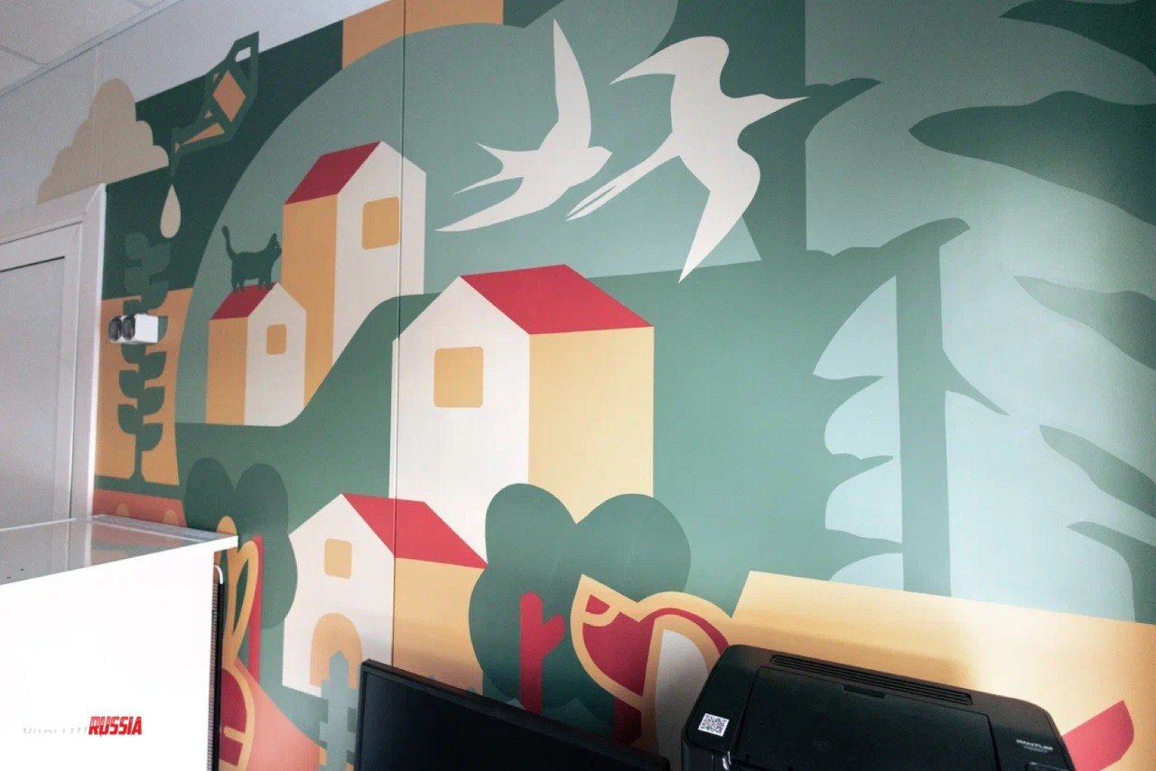 Команда проекта постаралась создать в отделении чувство спокойствия и уюта. На рисунках – не хаос и резкие детали, а элементы природы – лес, солнце и облака. А еще герои из русских сказок – зайчики, лисички, белочки и веселые обитатели джунглей – обезьянки и птицы.