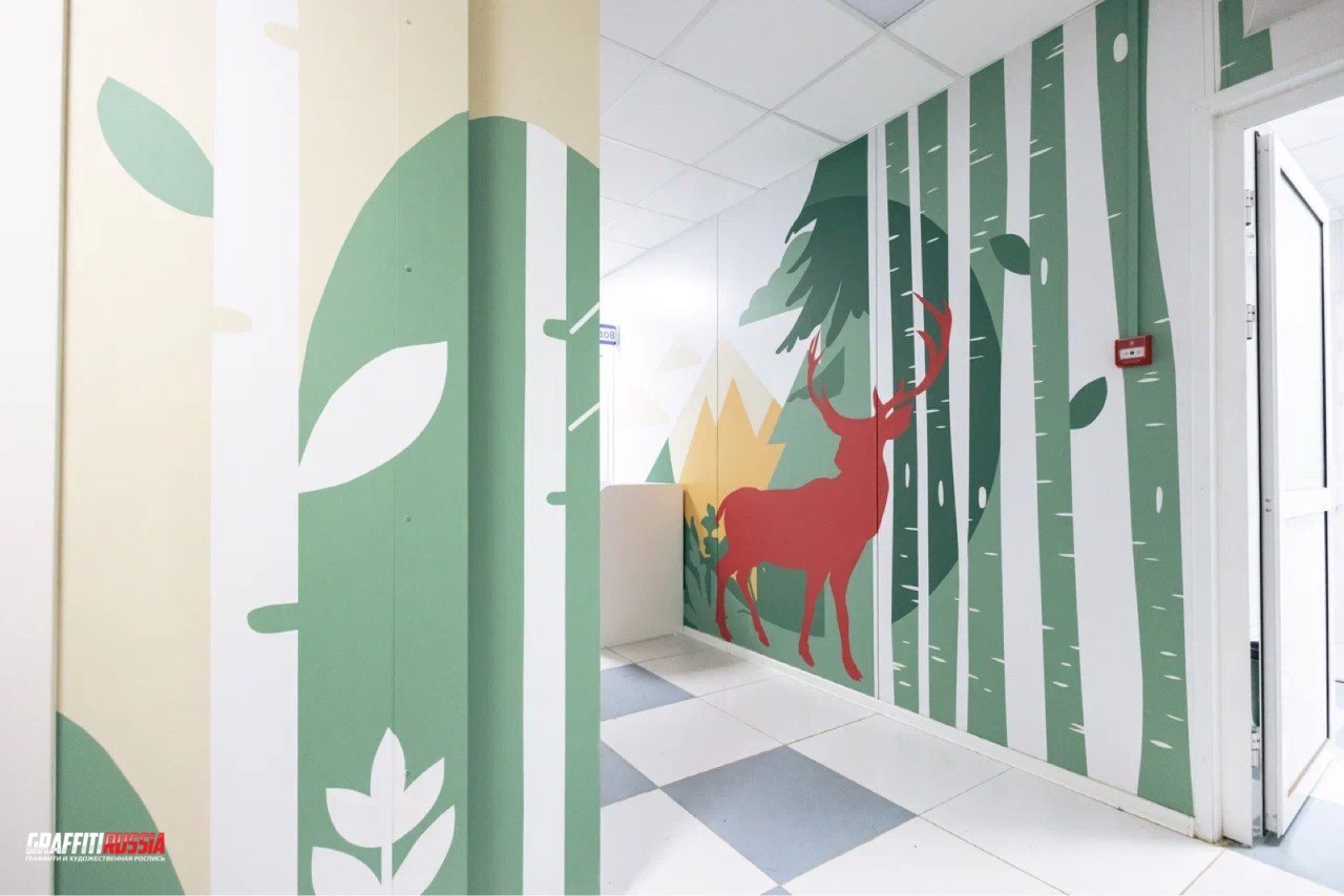 Художники создали необычный интерьер для детского отделения больницы в городе Карталы. Они оформили помещения так, чтобы малыши могли погрузиться в атмосферу сказочного леса. Для этого граффитисты использовали нежные натуральные оттенки и ненавязчивые флористические мотивы.