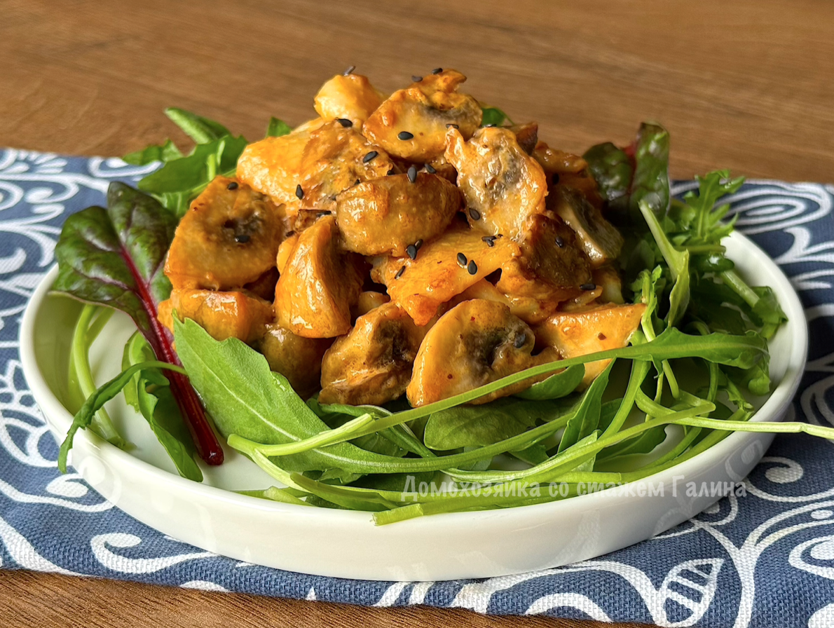 Первоначально необходимо тщательно очистить и промыть шампиньоны, нарезая их на четвертинки, оставляя мелкие целыми для большей эстетики. На раскаленной сковороде с добавлением сливочного масла обжарить грибы до золотистой корочки.