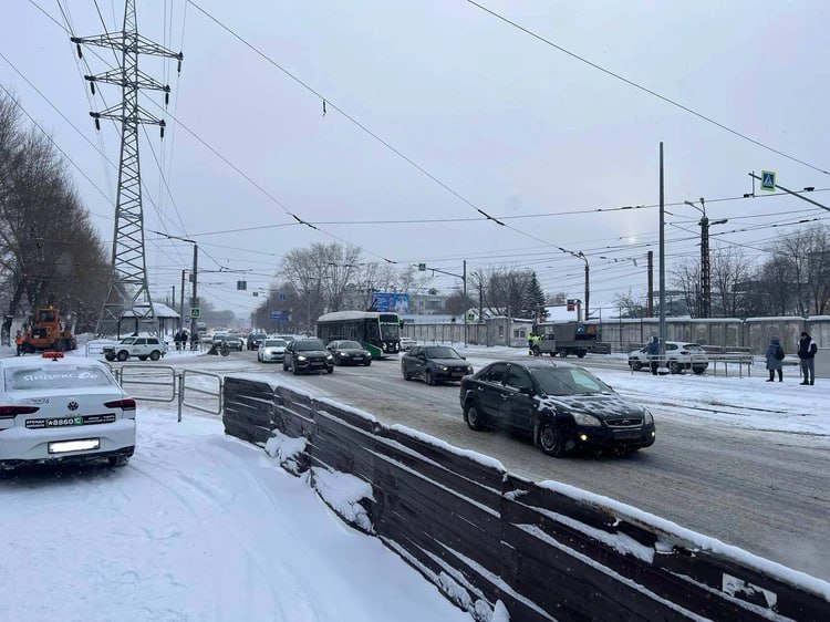 На улице Первой Пятилетки в Челябинске утром 10 февраля произошла авария. Трамвай сошел с рельсов и столкнулся с легковушкой.