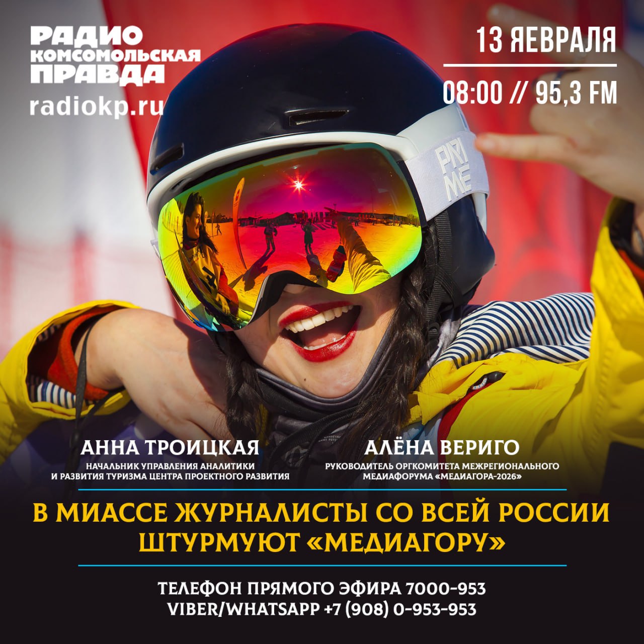 Соединим в одном эфире зимние заснеженные горы, уральскую кухню и журналистику! В конце февраля эти важные жизненные сферы объединятся уже вживую. С 27 февраля по 1 марта пройдёт форум «МедиагорА-2026» имени Ольги Давиденко. На горнолыжный курорт "Солнечная долина" под Миассом приедут редакторы и журналисты со всей страны, известные блогеры и пиар-стратеги. Им предстоит мозговой штурм на тему того, как «вкусно» рассказывать о регионах своей аудитории. Что ожидает гостей форума? В пятницу, 13 февраля, в 8:00 гости эфира - начальник управления аналитики и развития туризма Центра проектного развития Анна ТРОИЦКАЯ и руководитель оргкомитета межрегионального медиафорума "Медиагора-2026" Алена ВЕРИГО