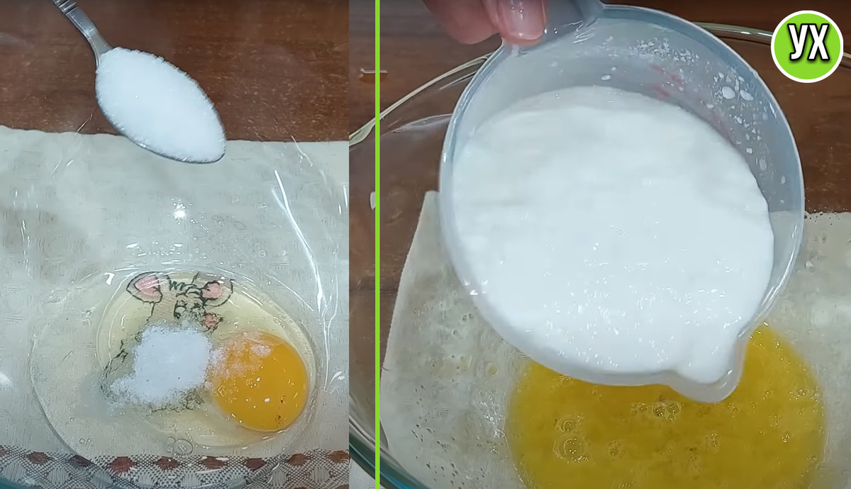 Для начала в миске разбивается яйцо, добавляется соль и сахар. Смесь нужно тщательно взбить венчиком. После этого влить кефир и снова все перемешать. Необходимо, чтобы все компоненты были комнатной температуры.