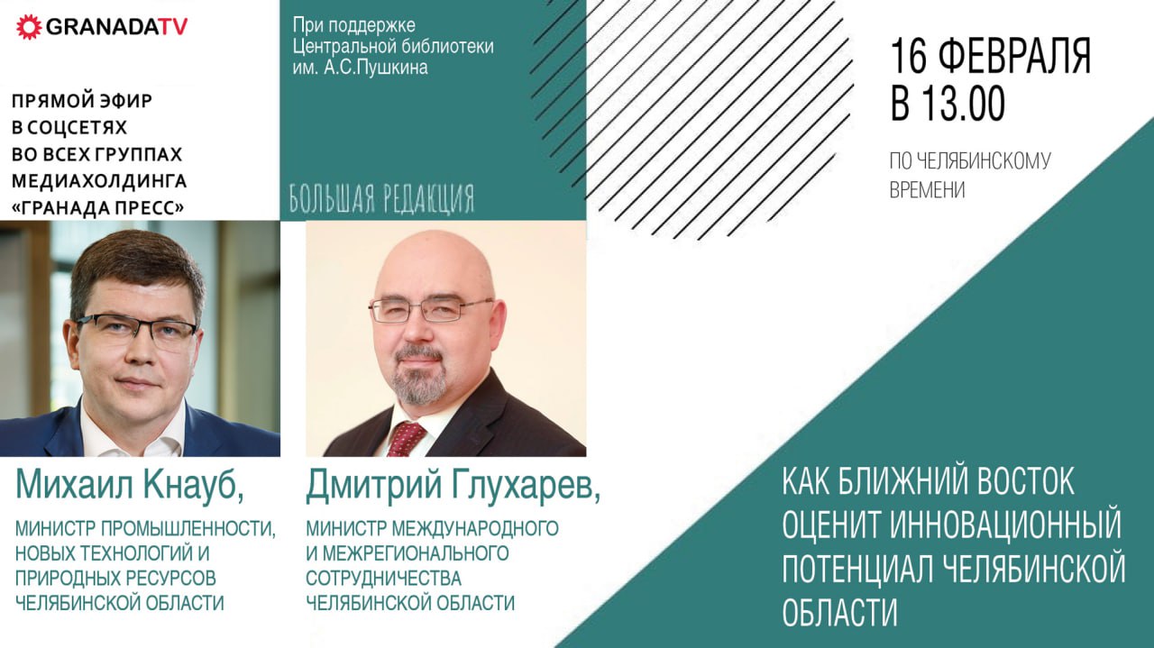 В понедельник, 16 февраля, в гостях у «Большой редакции» — Михаил Кнауб, министр промышленности, новых технологий и природных ресурсов Челябинской области, и Дмитрий Глухарев, министр международного и межрегионального сотрудничества Челябинской области.