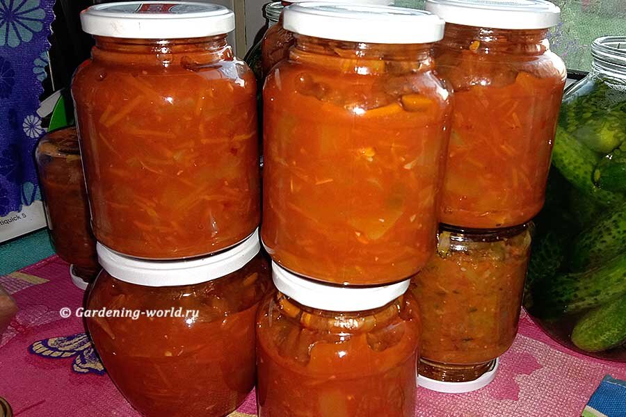 Горячий салат разлить в стерилизованные баночки, закрыть крышками и перевернуть до остывания.