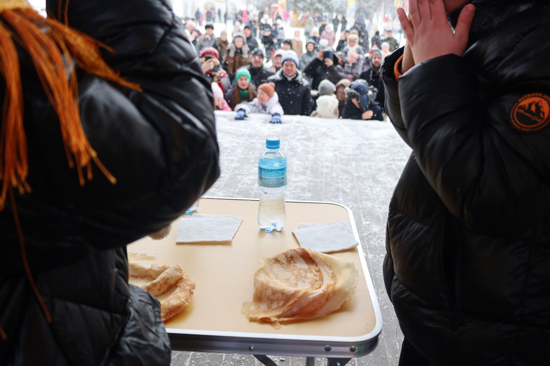Среди взрослых разгорелась нешуточная борьба: трое мужчин отважно ели блины, двое из них съели одинаковое количество, поэтому пришлось сделать финальный раунд. В итоге победа осталась за Арсением, которого активно поддерживала его девушка....