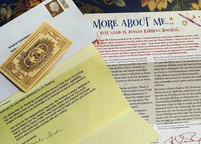 В конверт с почтовой маркой номиналом 3,5 фунта была вложена красочная брошюра с творческой биографией Джоан Роулинг и само письмо. В присланном тексте помощница извинилась, что пришлось дать «разочаровывающий ответ».