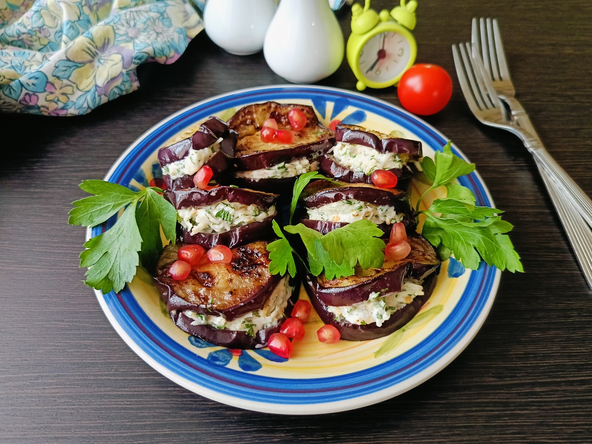 Полученной начинкой нафаршировать баклажаны, а по желанию украсить по своему вкусу. И вот, изысканная закуска готова к подаче!