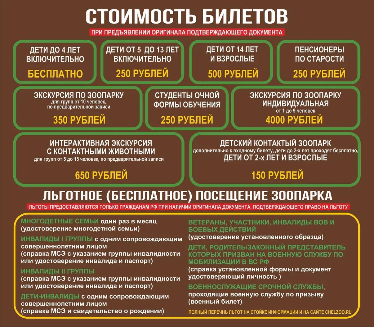 Изменились и цены на экскурсии. Групповой тур с квестом — 350 рублей с человека, занятие с животными — 650. Льготы предоставляются только при предъявлении оригиналов документов.