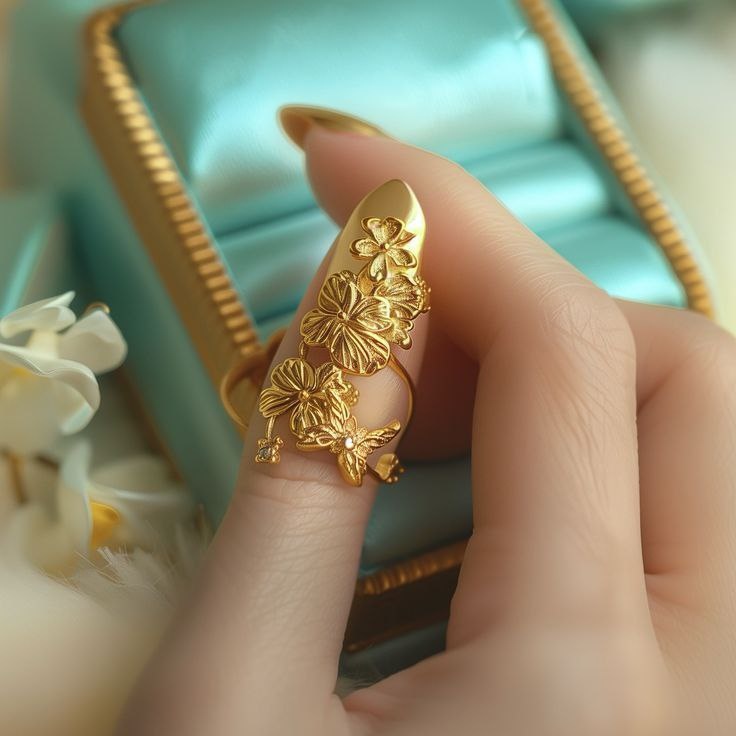 Эта уникальная деталь ювелирного искусства оформлена в виде цветочного орнамента с тонкой филигранью и объемными лепестками. Маленькие подвесные элементы добавляют ей игривости и легкости, создавая эффект «второго слоя» поверх маникюра.