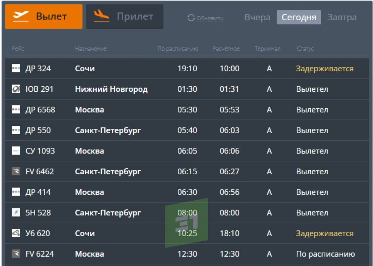 Рейс «Победы» был запланирован на 19:10, его перенесли на 10:00 понедельника. Борт «Уральских авиалиний» отправится с задержкой почти на 8 часов — вместо 10:25 в 18:10.