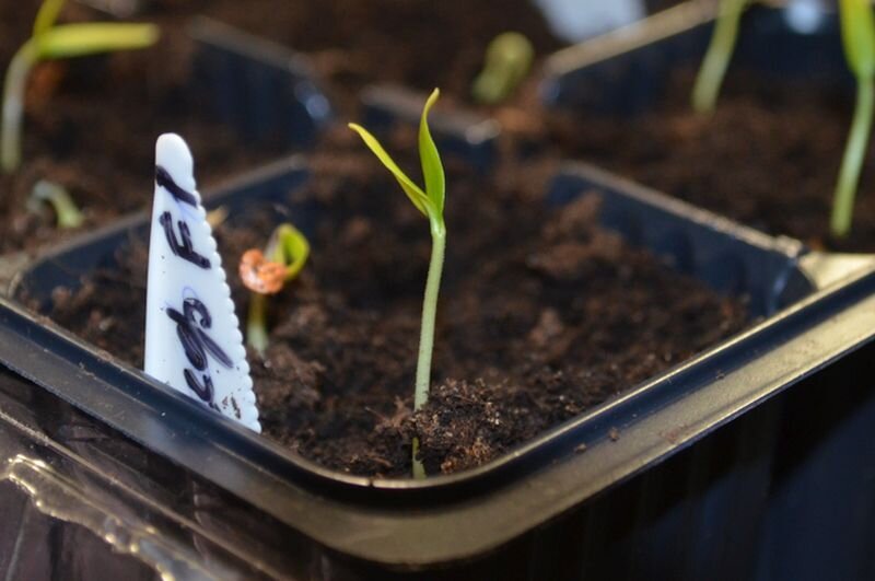 После посева семян сладкого перца их разместили рядом с печкой, где температура воздуха держится на уровне +25 градусов. Однако света там недостаточно. После появления всходов кассеты с рассадой были перемещены на подоконник, где уже с начала марта стало достаточно солнечного света.
