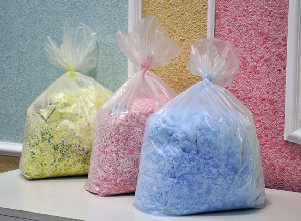 Основой жидких обоев является целлюлозное волокно, которое измельчают и смешивают с сухим клеем, пигментами и декоративными добавками. В перечень возможных материалов для декора входят: