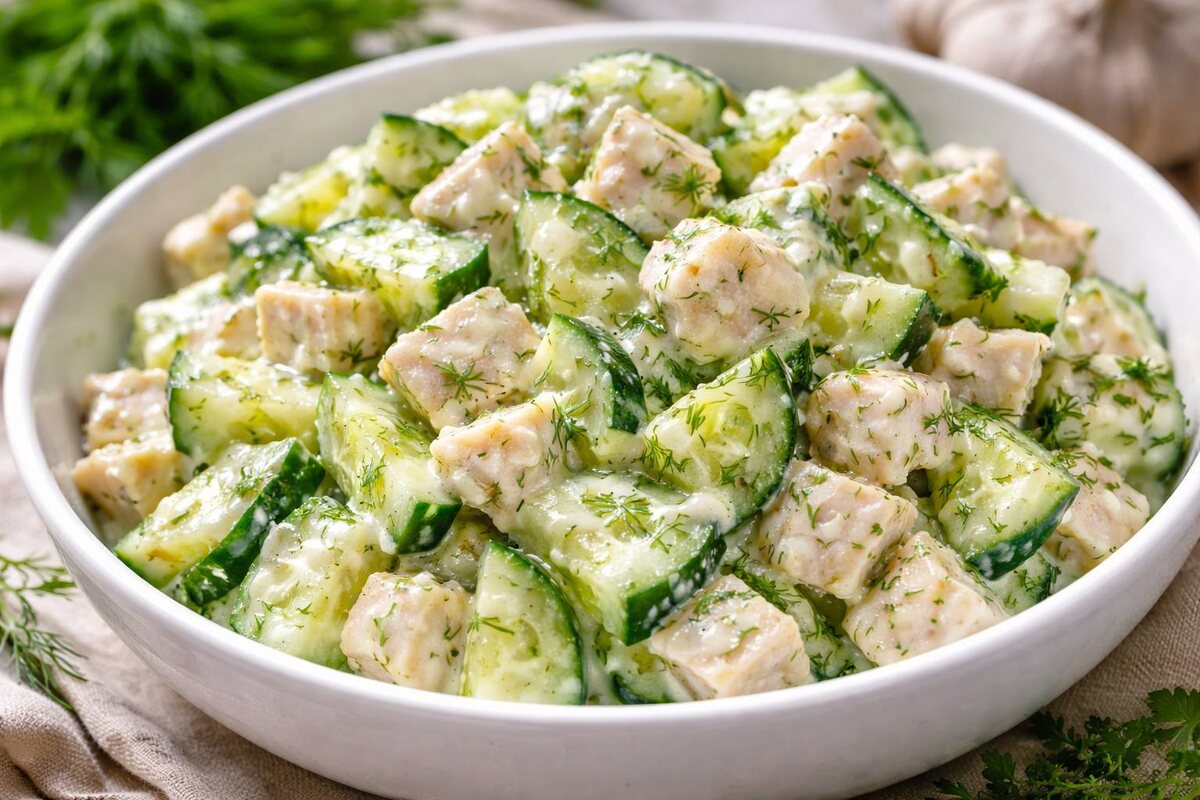 Этот салат быстро исчезает со стола благодаря идеальному балансу ингредиентов: курица придает сытости, огурец освежает, а чесночный соус связывает все вместе в гармоничное блюдо. Его можно подавать как самостоятельное угощение или на гарнир к горячим блюдам. Приготовьте его один раз, и он станет вашим любимым рецептом для быстрого и вкусного ужина.