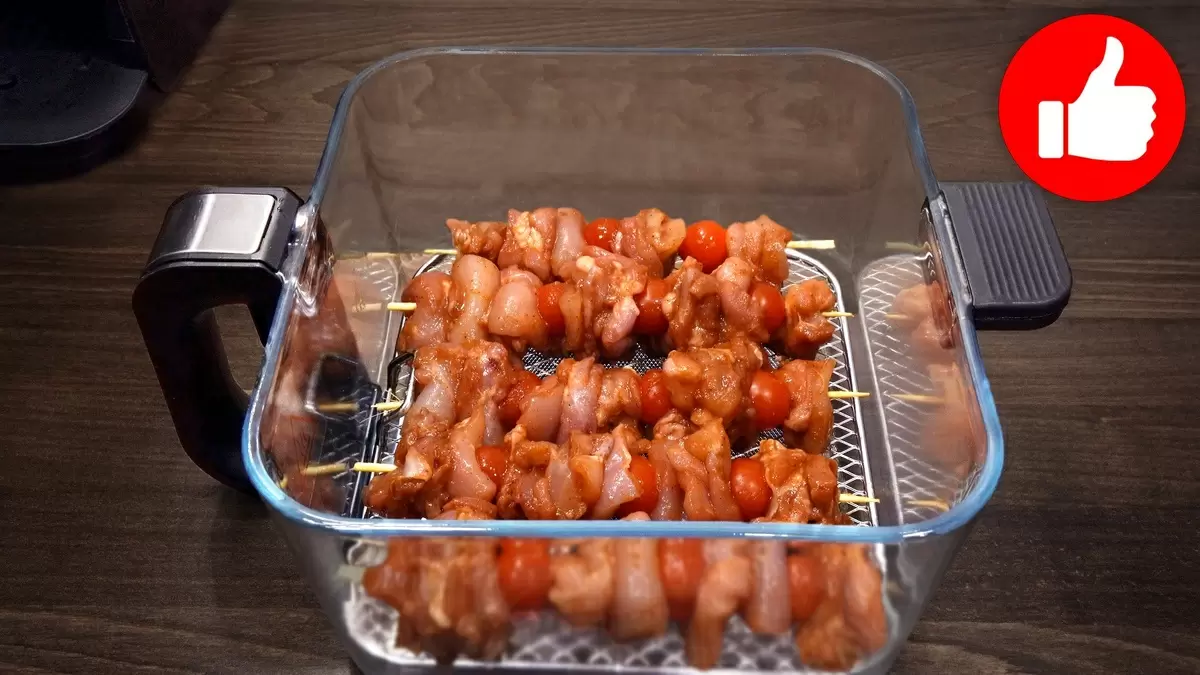 Пока курица маринуется, следует подготовить шпажки: замочить их в холодной воде, чтобы предотвратить подгорание во время приготовления. После того как куриное филе замариновалось, нанизать его на шпажки, чередуя с помидорами черри. Выложить шашлыки в корзину аэрогриля и готовить на режиме «Мультиповар» при температуре 180 °C в течение 18 минут.
