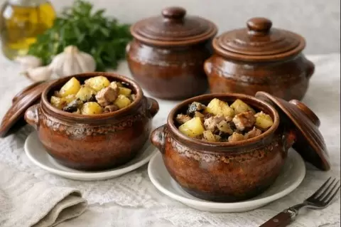 - Разложить по горшочкам и запекать при 180 градусах в течение 1 часа.