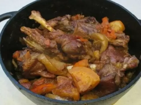 В толстостенной посуде разогреть 2-3 ст. л. масла, обжаривать кусочки гуся с обеих сторон 4-5 минут до золотистой корочки. Выкладывать обжаренные куски на тарелку. В том же жире обжарить нарезанный лук и морковь в течение 5-7 минут, затем добавить чеснок и корень сельдерея, продолжая жарить еще 3-4 минуты. Для достижения насыщенного вкуса следует добавить вино и выпарить его наполовину.