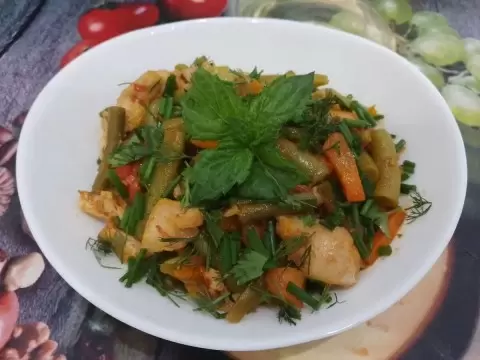 Напоследок в сковороду добавляют заранее подготовленную спаржевую фасоль и тушат все вместе 20 минут, периодически помешивая. За 5 минут до готовности добавляют чеснок, соль и молотый перец по вкусу. Подают блюдо украшенным свежей зеленью, что добавит изюминку и свежесть вкуса!