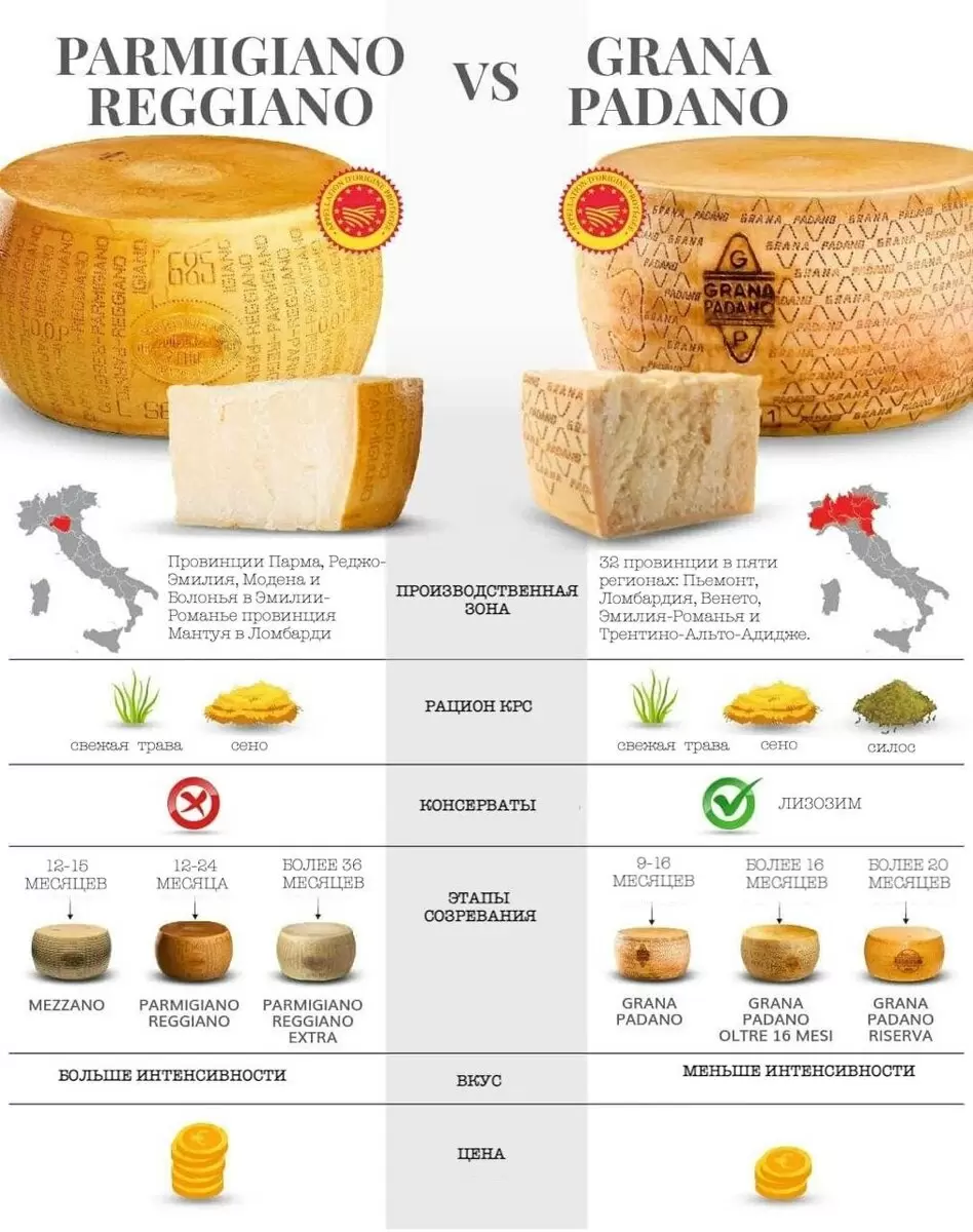 • Цена: Пармиджано-Реджано обычно дороже из-за более длительного процесса производства и высокой репутации.
