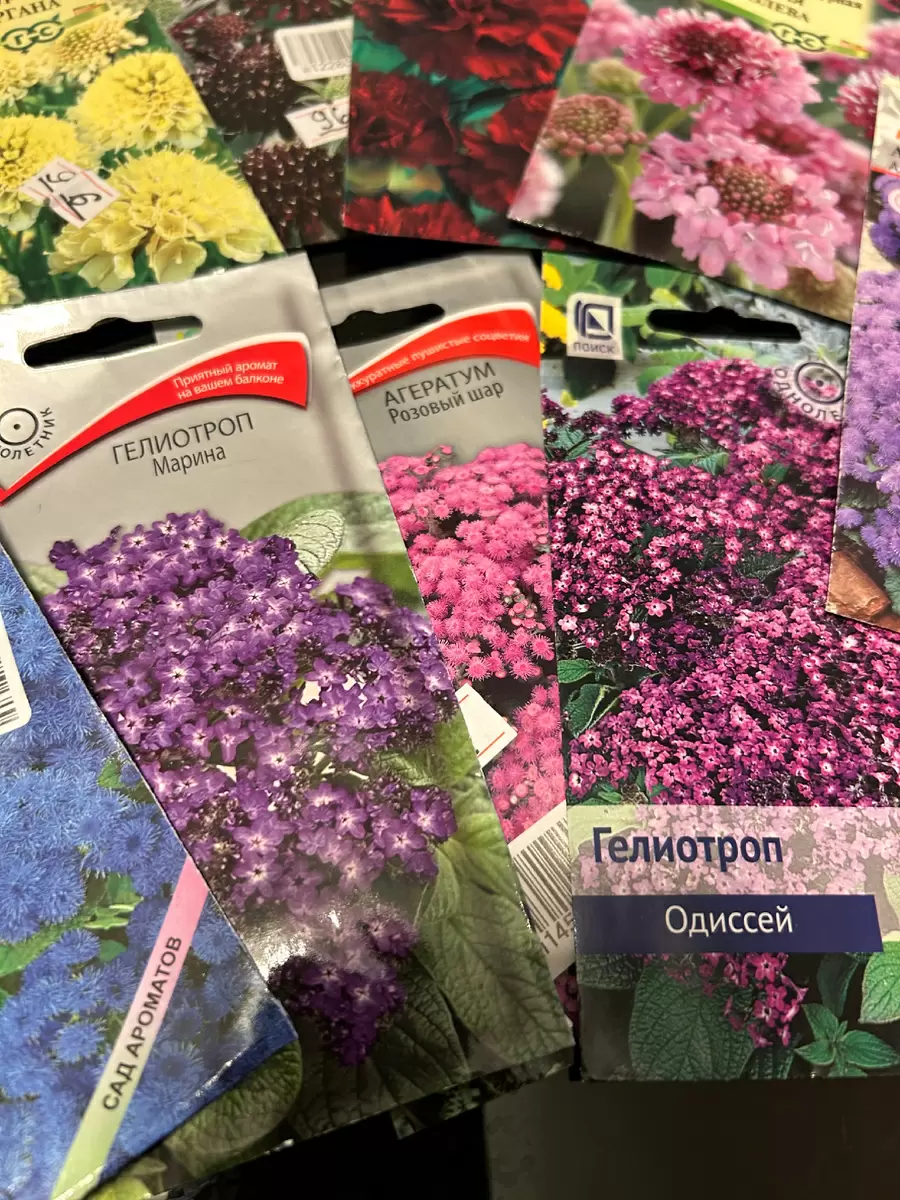 В этом сезоне акцент сделан на проверенных растениях: не было приобретено ни одного многолетника. Однако выбрать несколько сортов агератума, скабиозы и цинний было непросто. Среди новинок — гелиотроп, который многие садоводы хвалят, в том числе два сорта: «Марина» и «Одиссей».