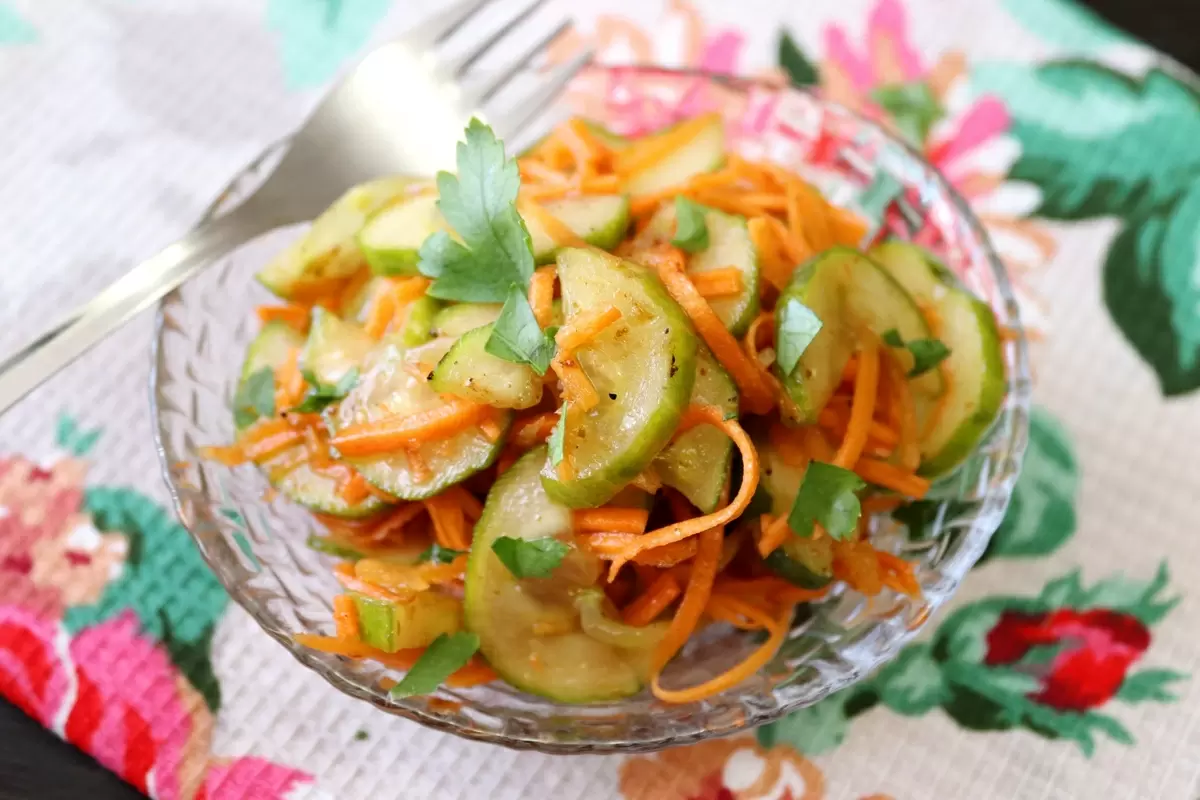 Для тех, кто ищет быстрые и аппетитные закуски, пряный салат из свежих огурцов и моркови станет настоящей находкой. Этот освежающий и хрустящий рецепт займёт не больше 30 минут вашего времени, а для полного раскрытия вкуса потребуется небольшое маринование. Приготовление займет всего лишь 30 минут, затем нужно оставить блюдо на 2 часа в холодильнике.