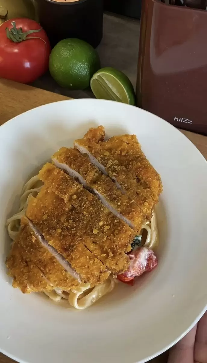 Шаг 2: Обжарьте шницель до золотистой корочки и параллельно варите спагетти.