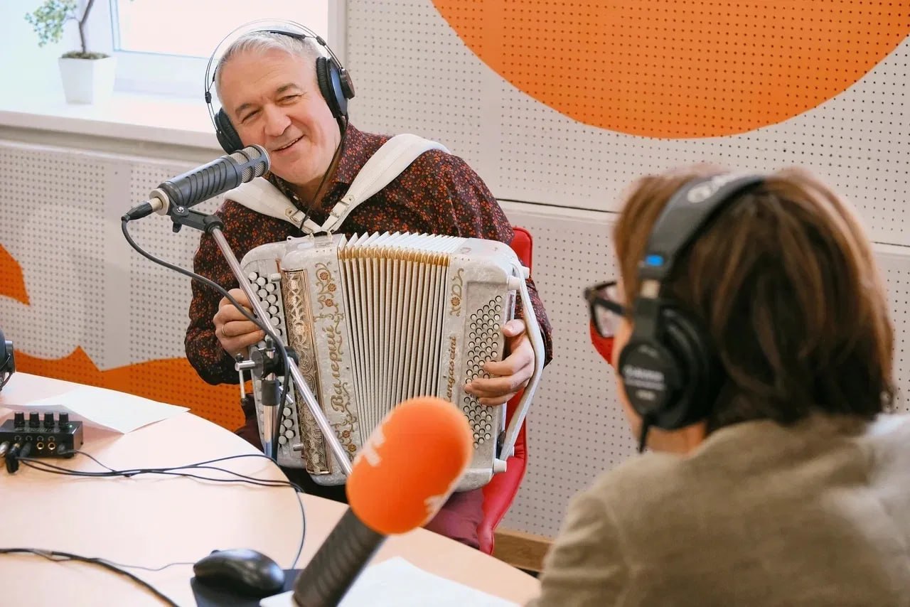 Первый прямой эфир радиостанции "Песни от всей души" из студии в Челябинске вместе с Андреем Малаховым провели ведущий Антон Демидов и баянист Валерий Семин, сообщает ИС "Вести".