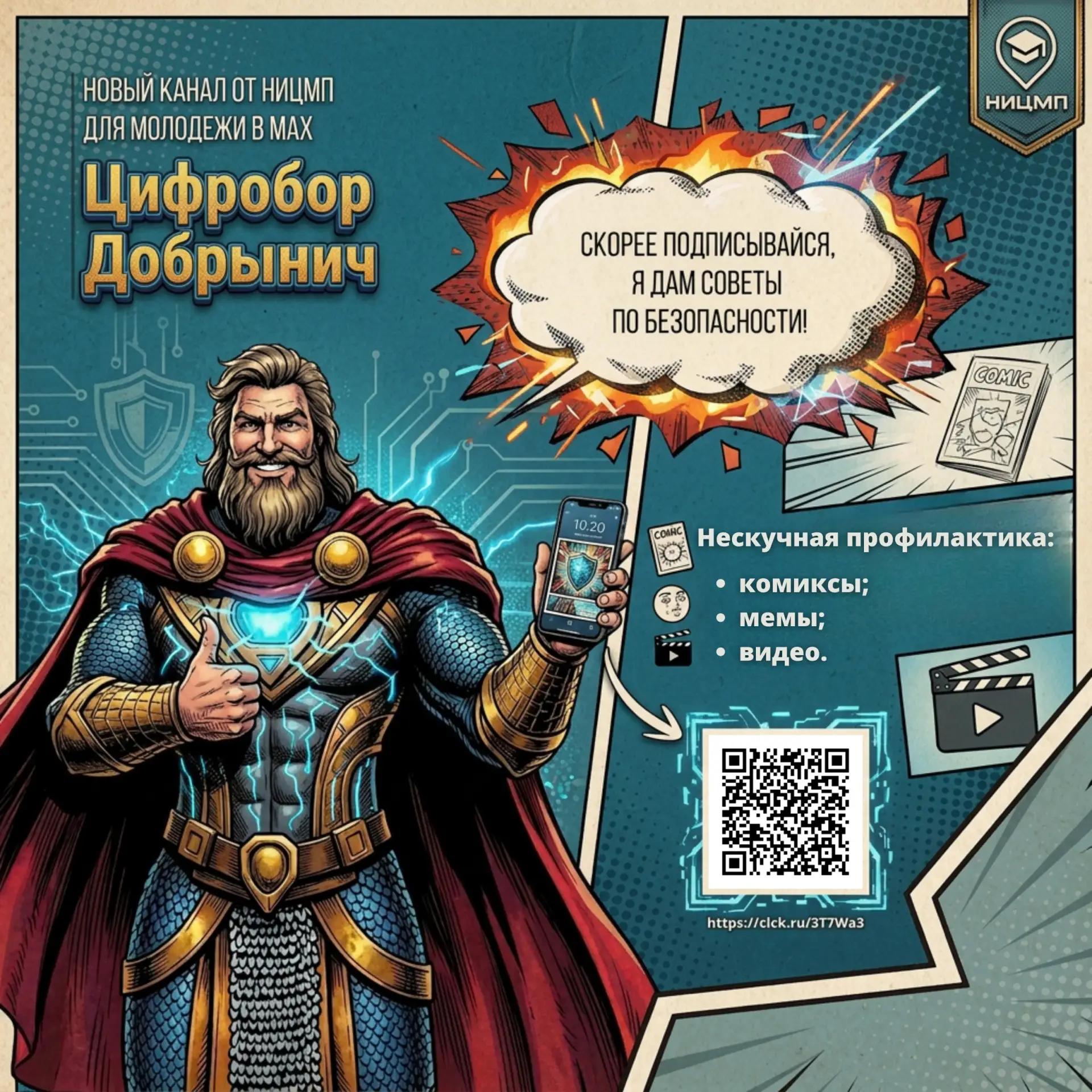 Теперь Цифробор Добрынич не только спасает от цифровых угроз в комиксах, но и делится советами прямо в мессенджере. В его канале — еще больше реальных кейсов и историй, мемы и короткие видео.