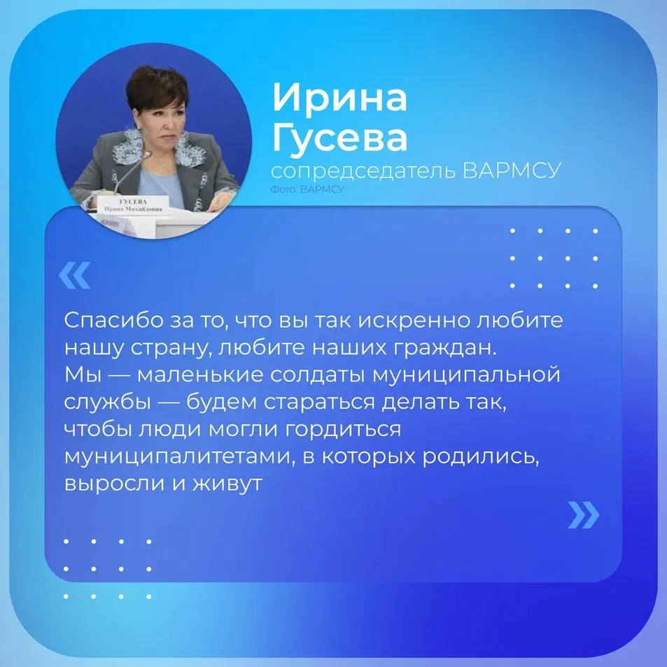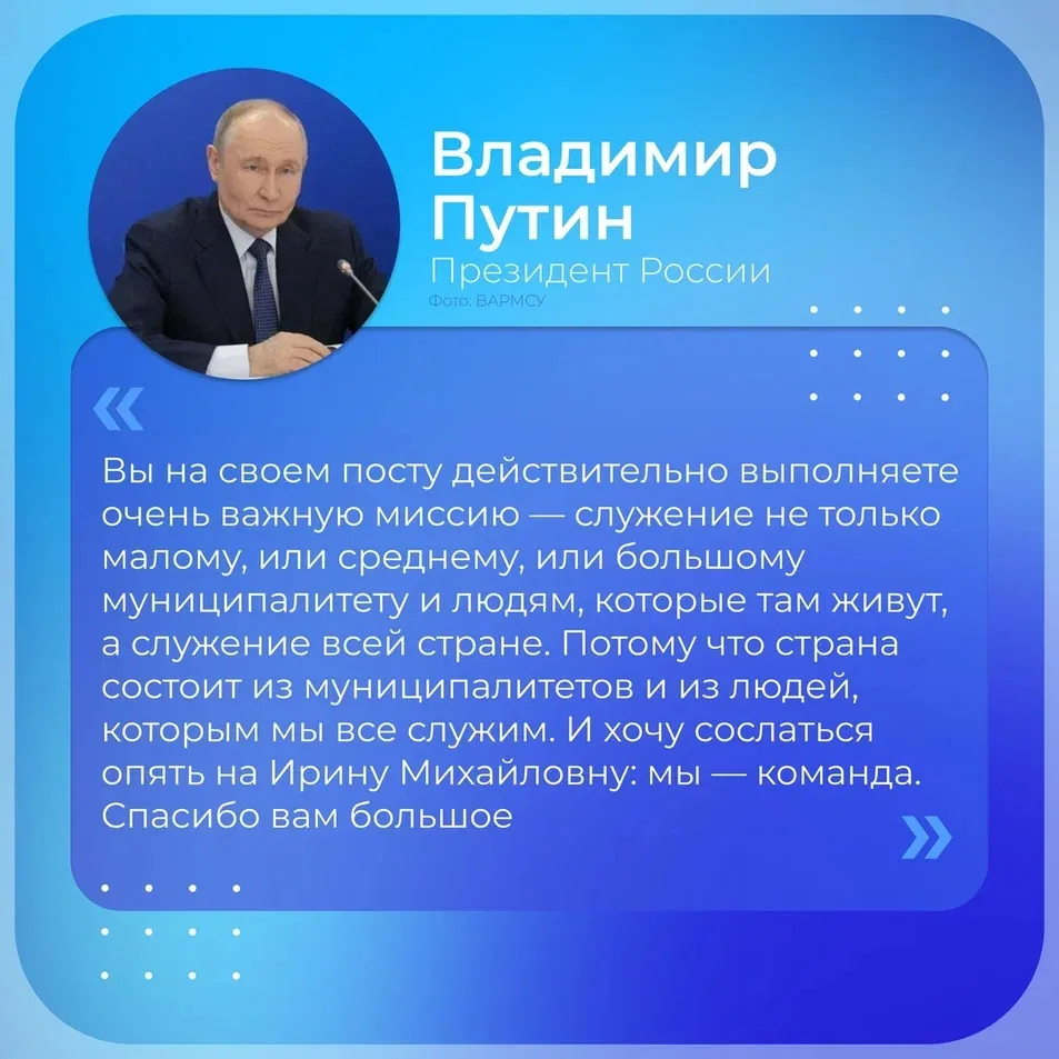 В День местного самоуправленияПрезидент России Владимир Путин встретился с представителями муниципального сообщества. Мероприятие прошло в рамках III Всероссийского муниципального форума «МАЛАЯ РОДИНА — СИЛА РОССИИ», который организовала ВАРМСУ при поддержке Администрации Президента.