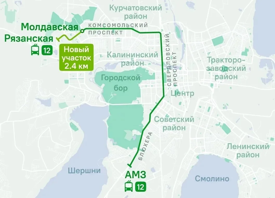 Новый участок проходит от Молдавской по Комсомольскому проспекту, улицам Чичерина и Салавата Юлаева. Его протяженность — 2,4 км.