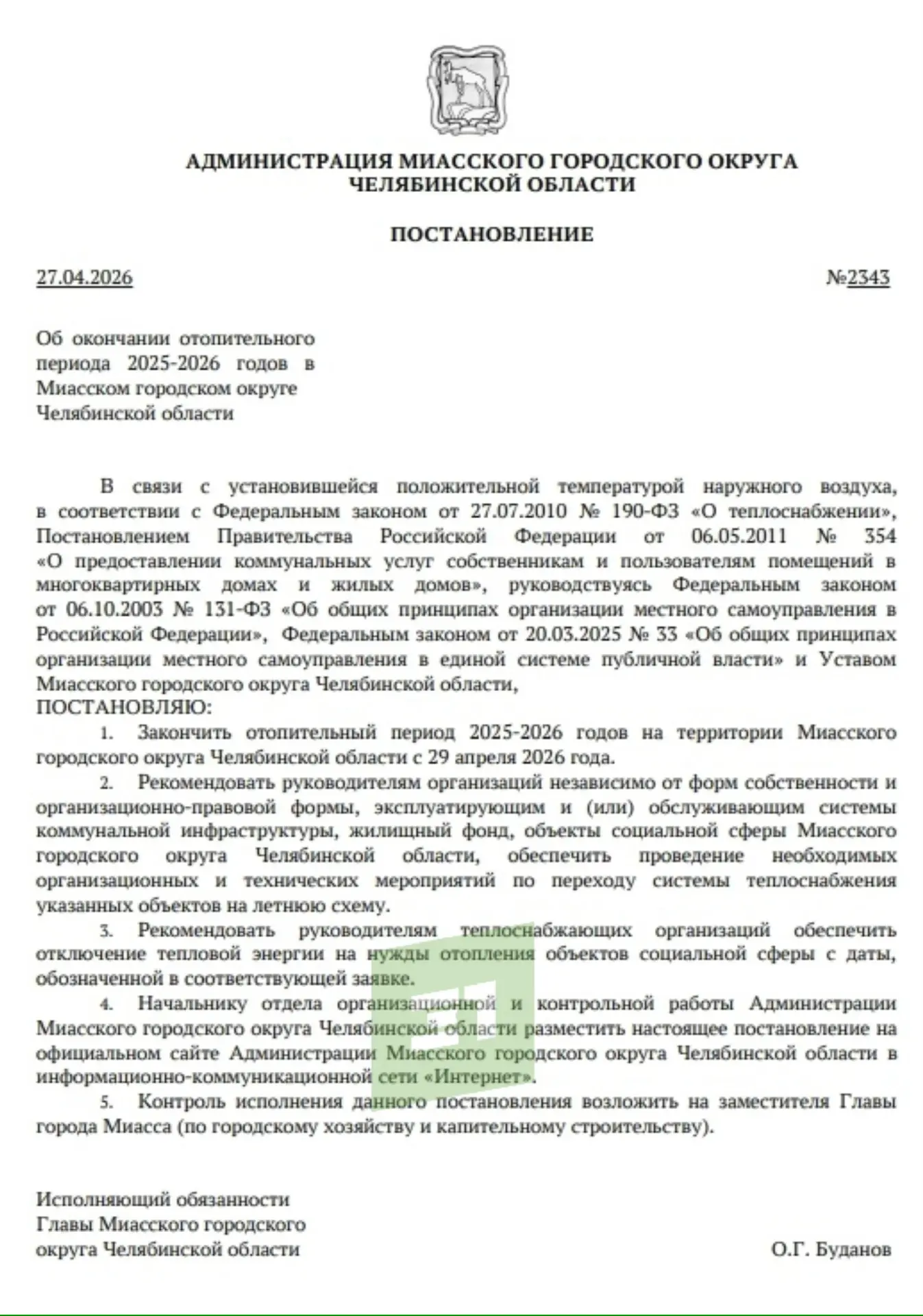 Миасского городского округа Челябинской области, ПОСТАНОВЛЯЮ: Закончить отопительный период 2025-2026 годов на территории Миасского городского округа с 29 апреля 2026 года»