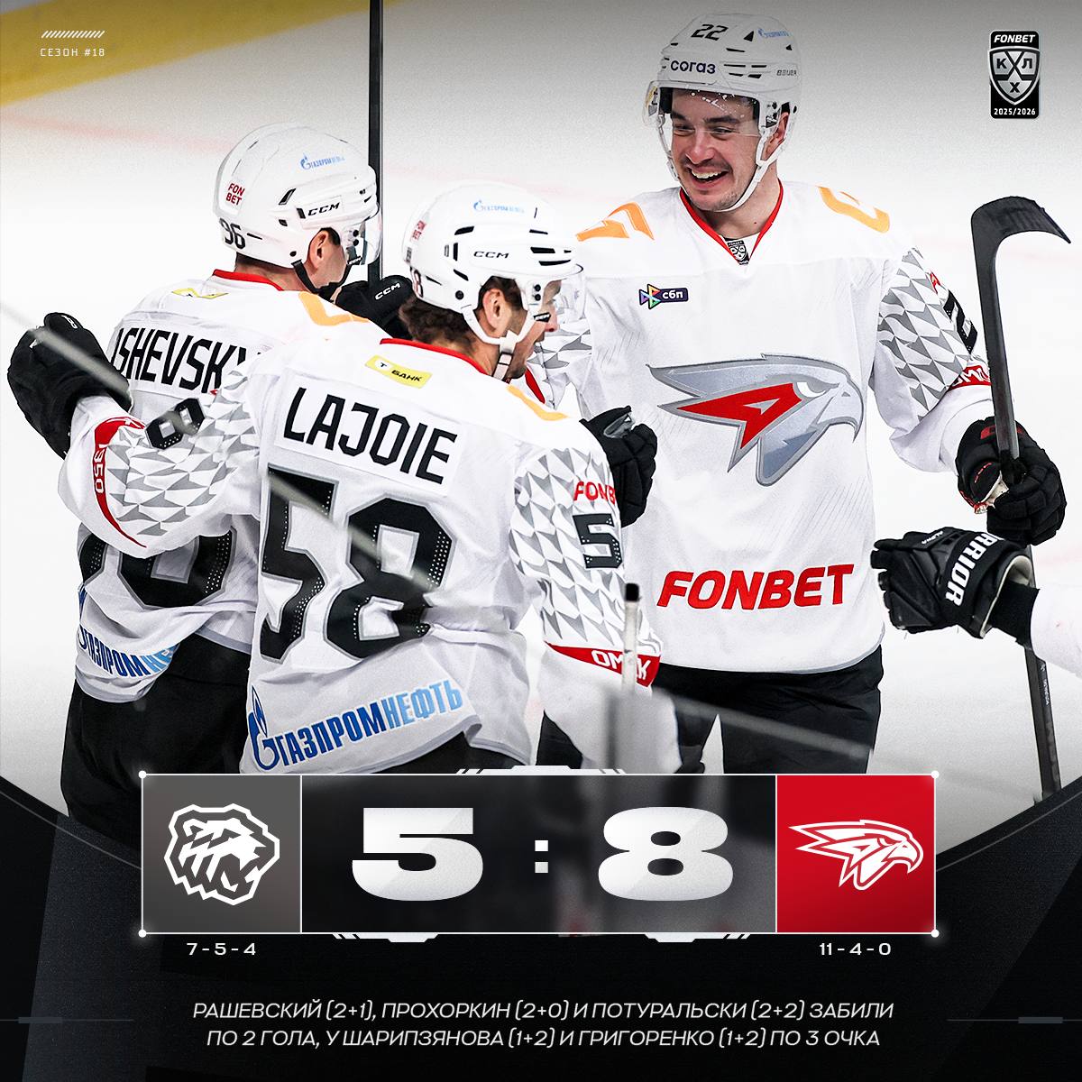 В составе хозяев шайбы забросили Егор Коршков (5-я минута), Федор Крощинский (17), Джош Ливо (23), Пьеррик Дюбе (27) и Михаил Григоренко (38). У гостей отличились Василий Пономарев (5), Дамир Шарипзянов (11), Дмитрий Рашевский (12, 32), Николай Прохоркин (15, 51) и Эндрю Потуральски (26, 56).