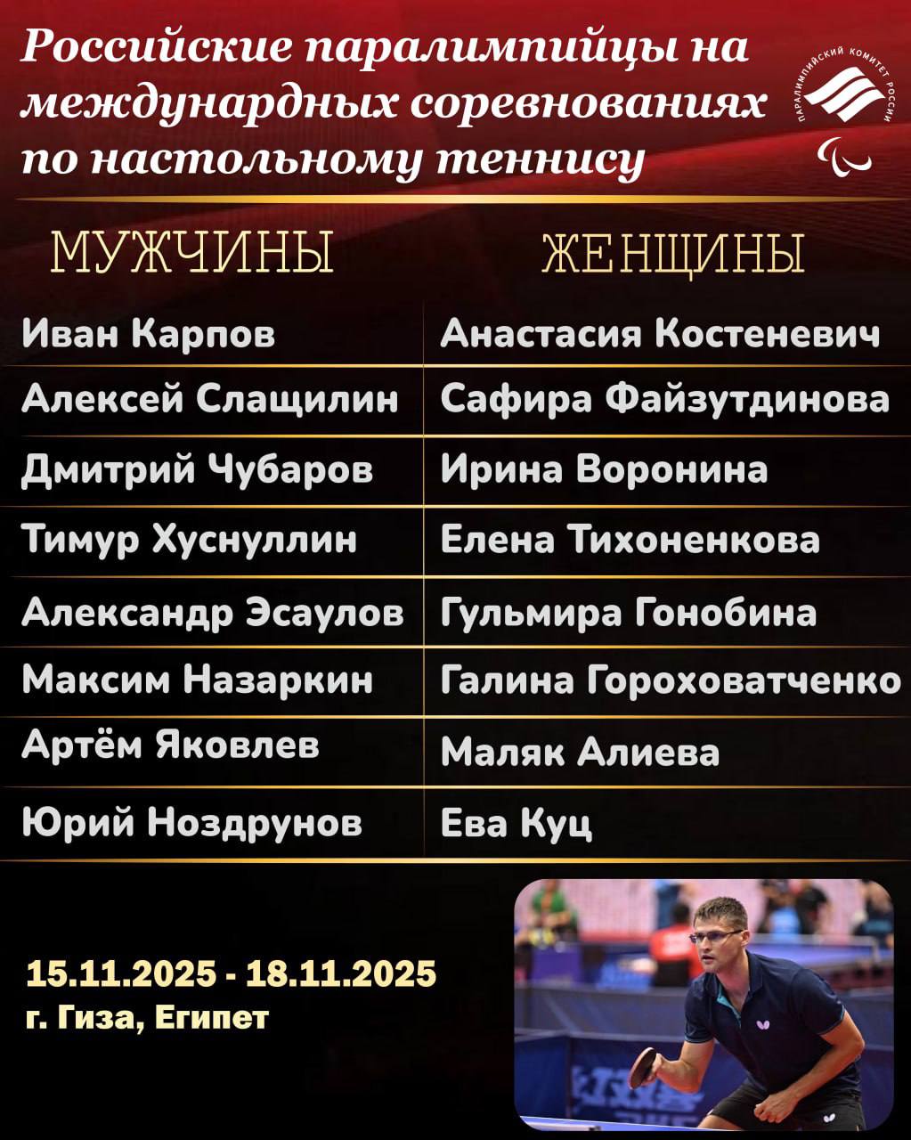 Четверо спортсменов из Челябинской области вошли в состав национальной сборнойдля участия в турнире «ITTF World Para Challenger Giza 2025», который пройдет с 15 по 18 ноября в египетской Гизе.