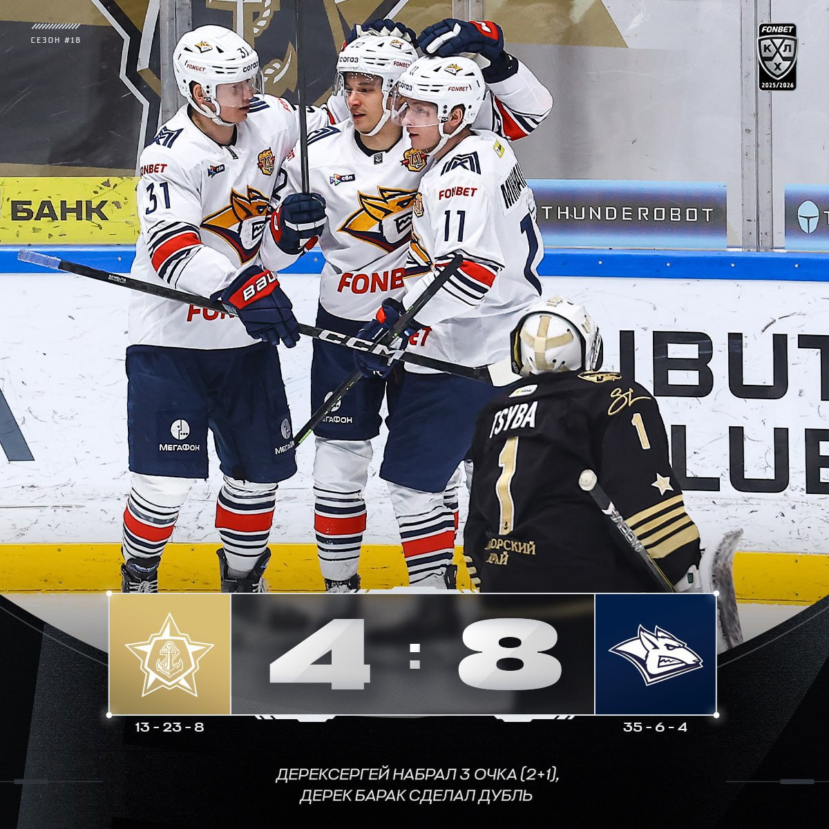 В составе победителей шайбы забросили Руслан Исхаков (3-я минута), Сергей Толчинский (5, 56), Дерек Барак (9, 21), Никита Коротков (16), Люк Джонсон (59) и Валерий Орехов (59). У проигравших отличились Степан Старков (7), Павел Шэн (12), Вячеслав Основин (29) и Никита Сошников (31).