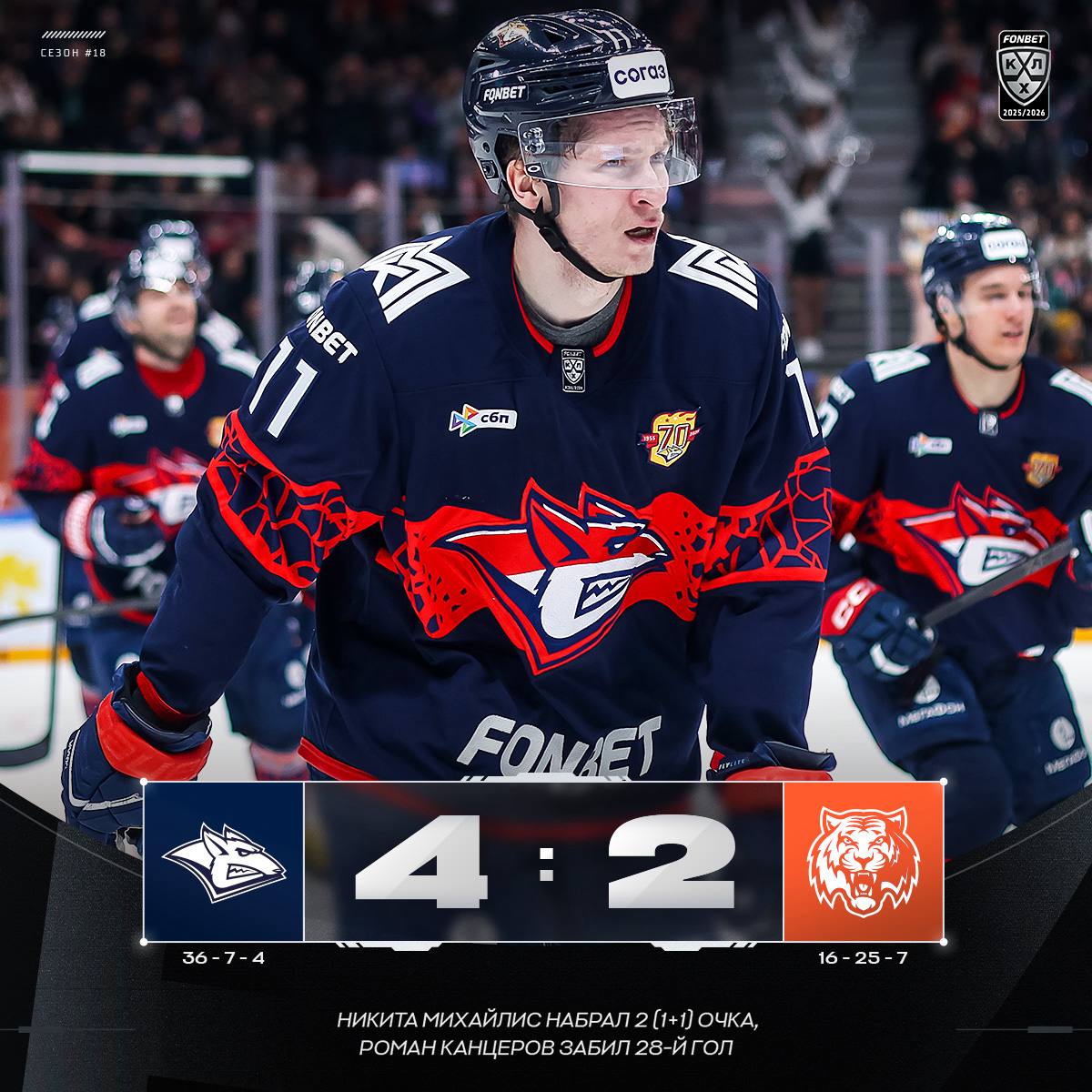 Магнитогорский «Металлург» обыграл хабаровский «Амур» со счетом 4:2 в домашнем матче регулярного чемпионата «Фонбет» — КХЛ.
