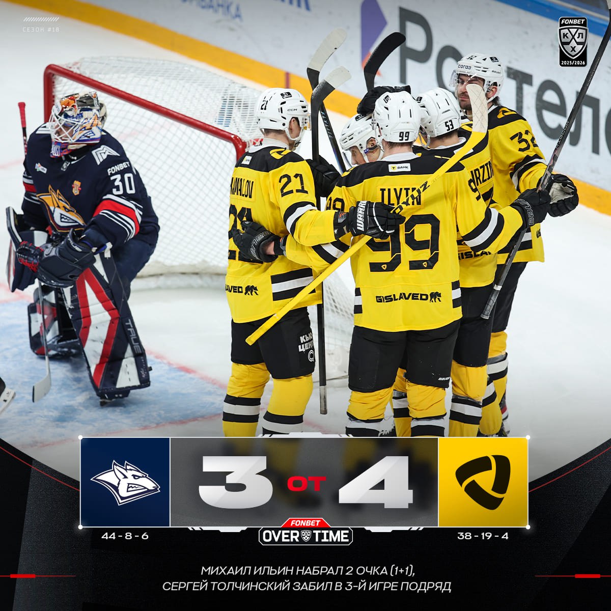 В составе гостей шайбы забросили Данил Веряев (4-я минута), Илья Квочко (10), Михаил Ильин (29) и Иоаннис Калдис (65). У хозяев отличились Сергей Толчинский (34), Никита Михайлис (48) и Роман Канцеров (50).