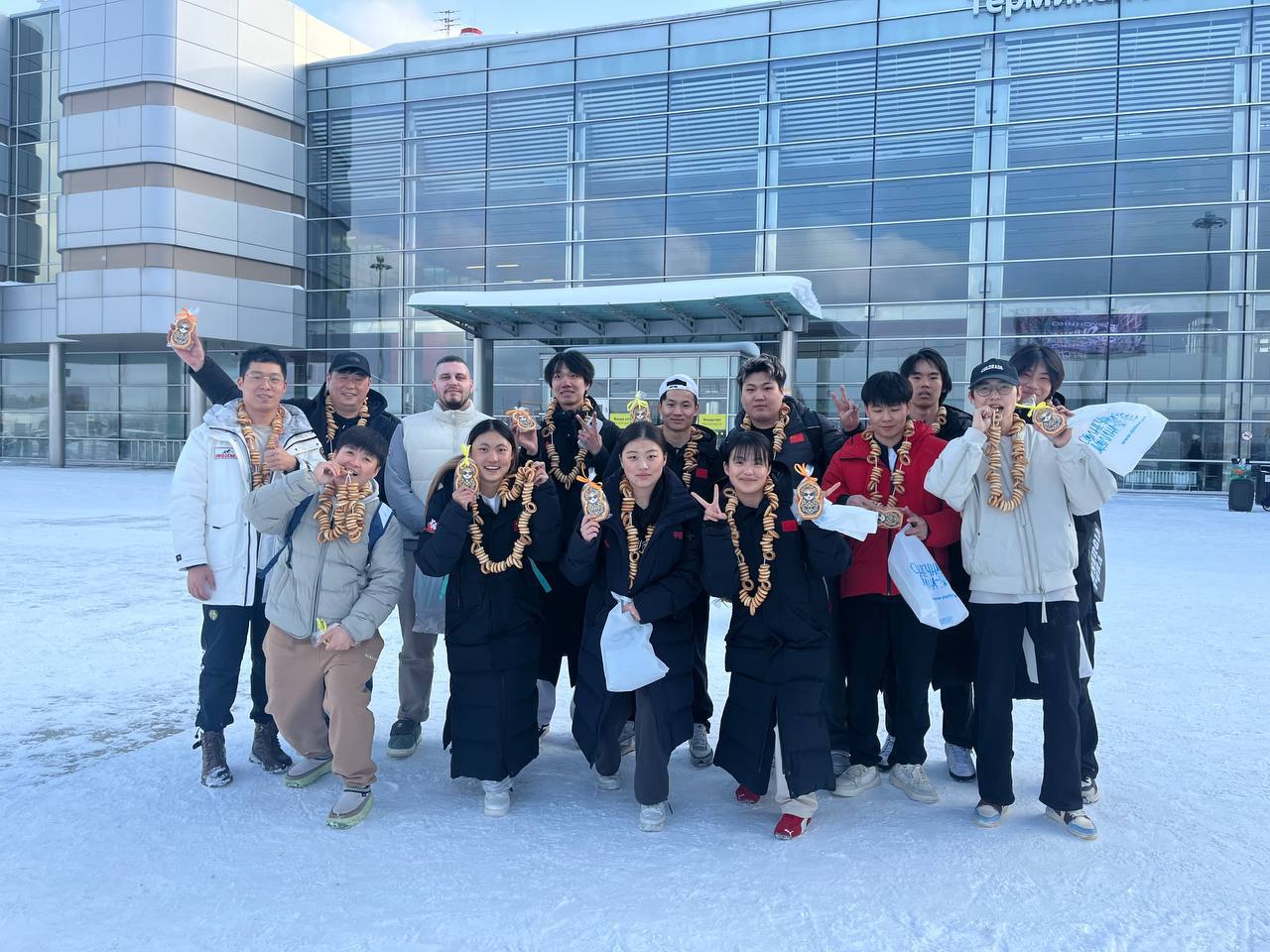 Китайские спортсмены уже приземлились в аэропорту "Кольцово" в Екатеринбурге. Здесь их ждал теплый прием - организаторы встретили гостей национальными угощениями - пряниками и баранками.
