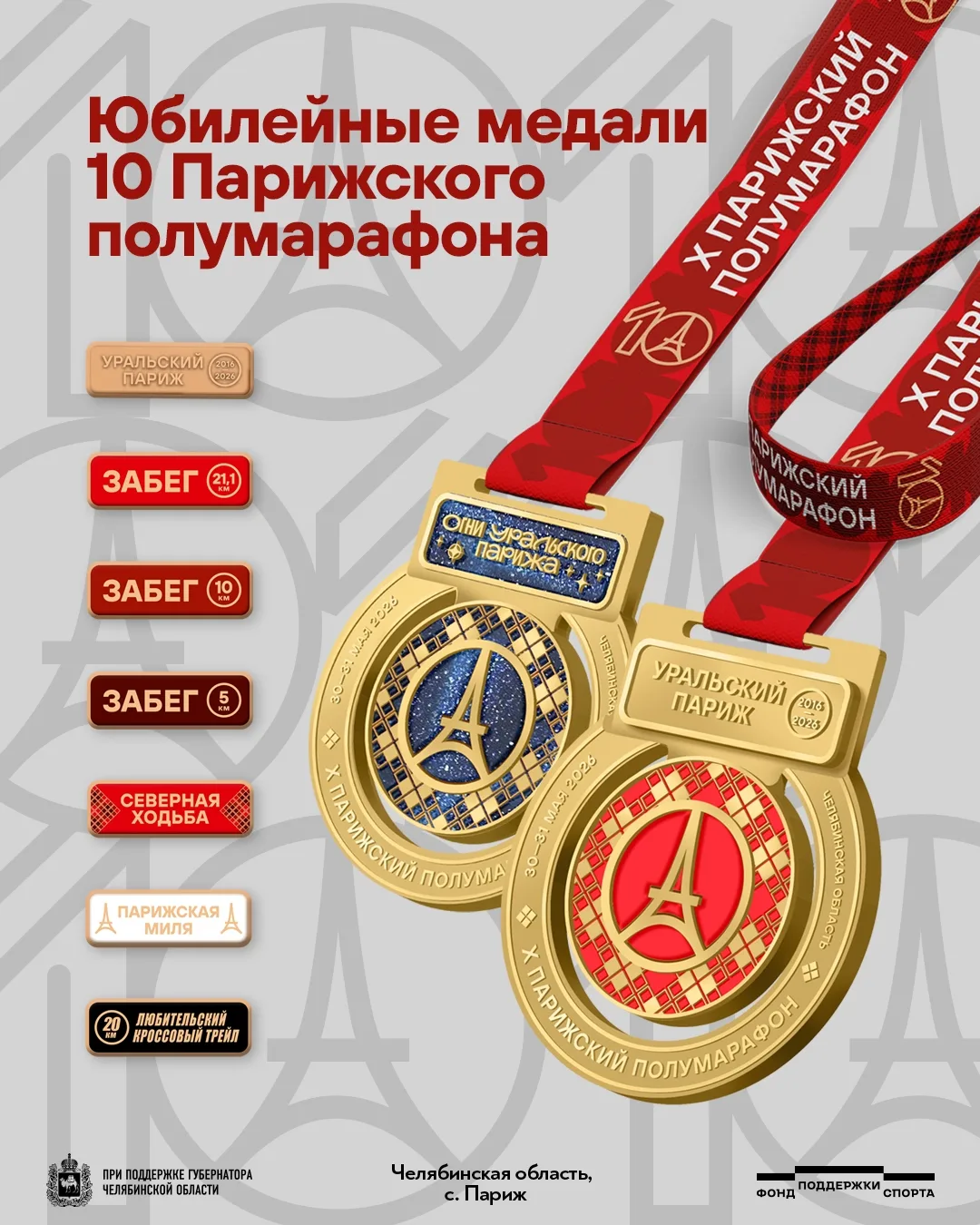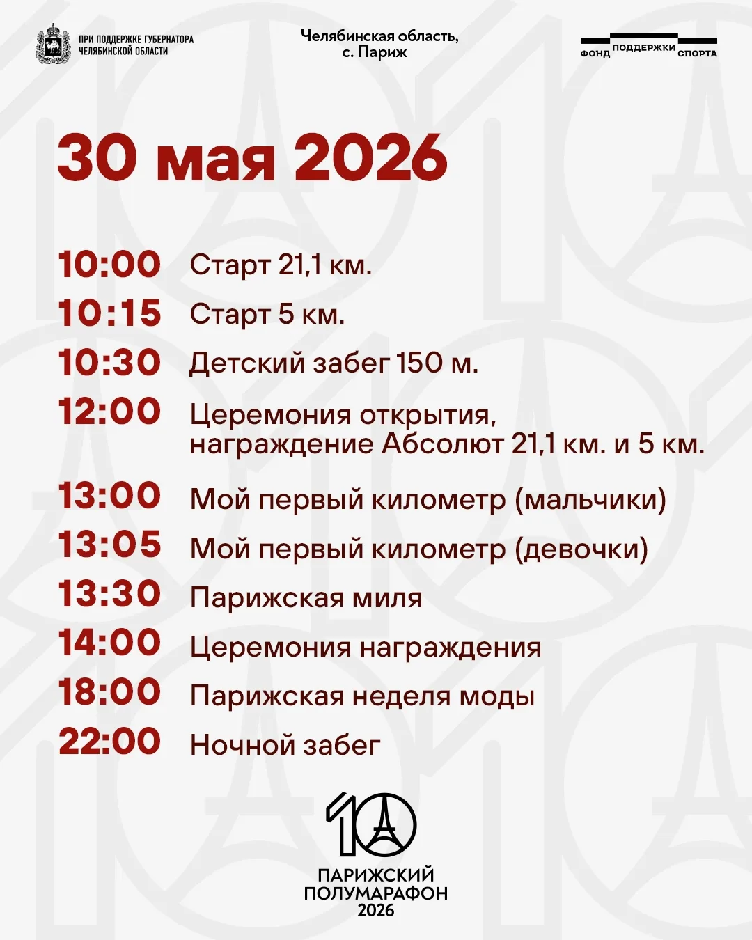 Юбилейный, десятый, Парижский полумарафон пройдет в Челябинской области 30 и 31 мая 2026 года. На старт в селе Париж Нагайбакского района выйдут любители бега, северной ходьбы и велоспорта. Ожидается, что в празднике спорта в колоритном селе примут участие рекордное количество атлетов всех возрастов.